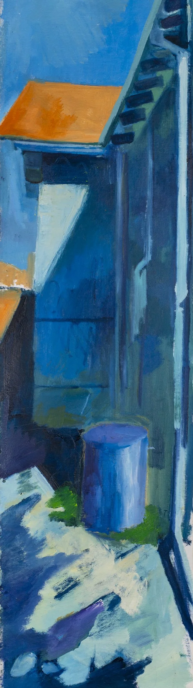 Vegetation, street elements, and seasonal light conditions appear throughout the paintings, adding context and atmosphere. The scenes range from industrial zones to residential streets, with structures that include conical turrets, water towers, and elevated railways. Each canvas reflects a distinct moment in the city’s visual landscape, captured through Singer’s energetic and precise approach to painting.