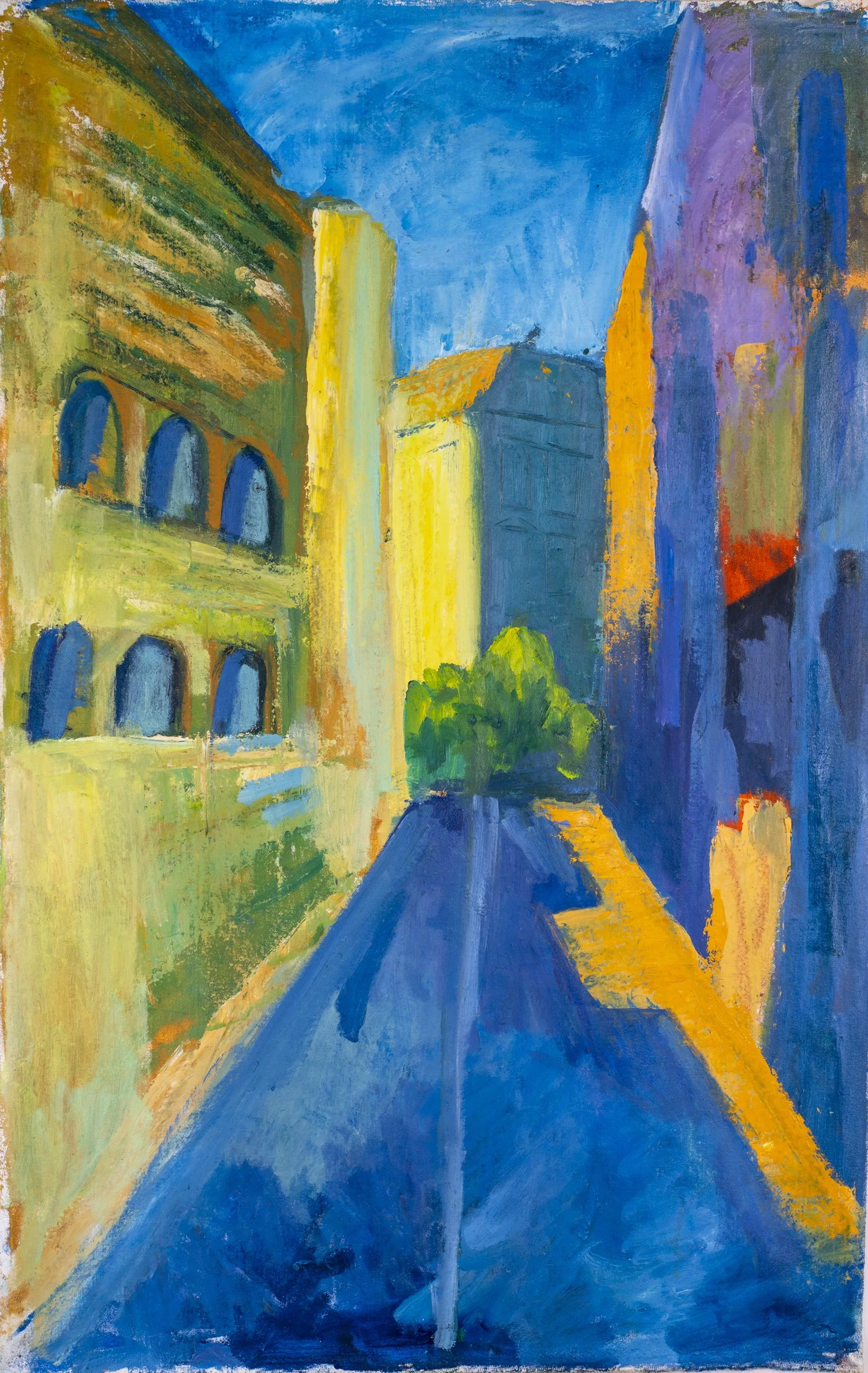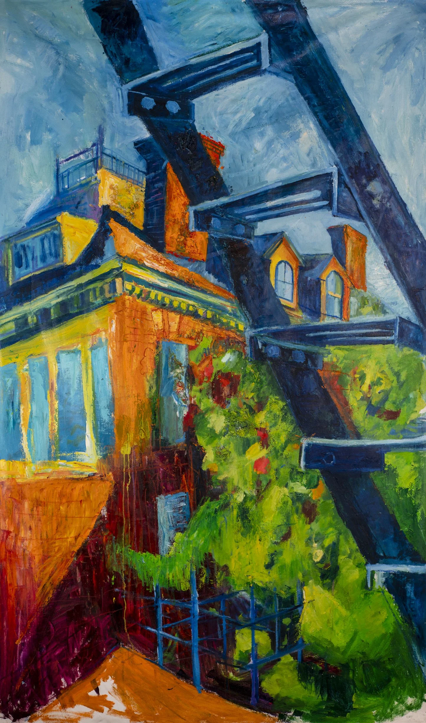Darren B. Singer’s architectural paintings depict urban structures from the city where he grew up, rendered with expressive brushwork and a vivid palette. His subjects include elevated train tracks, industrial smokestacks, steel bridges, and historic brick buildings. The compositions often feature strong diagonals and upward perspectives, emphasizing the scale and geometry of the built environment.